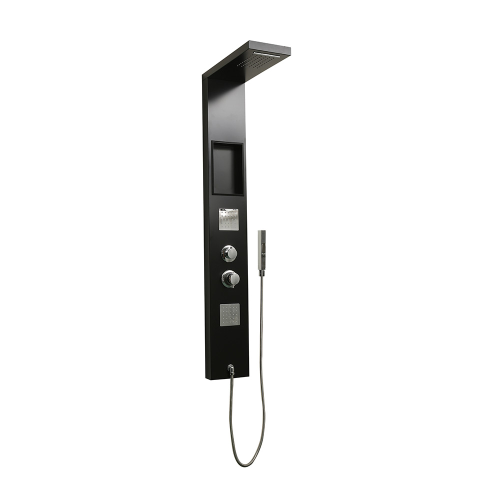 Coluna de hidromassagem em acabamento preto e alumínio. Tem 2