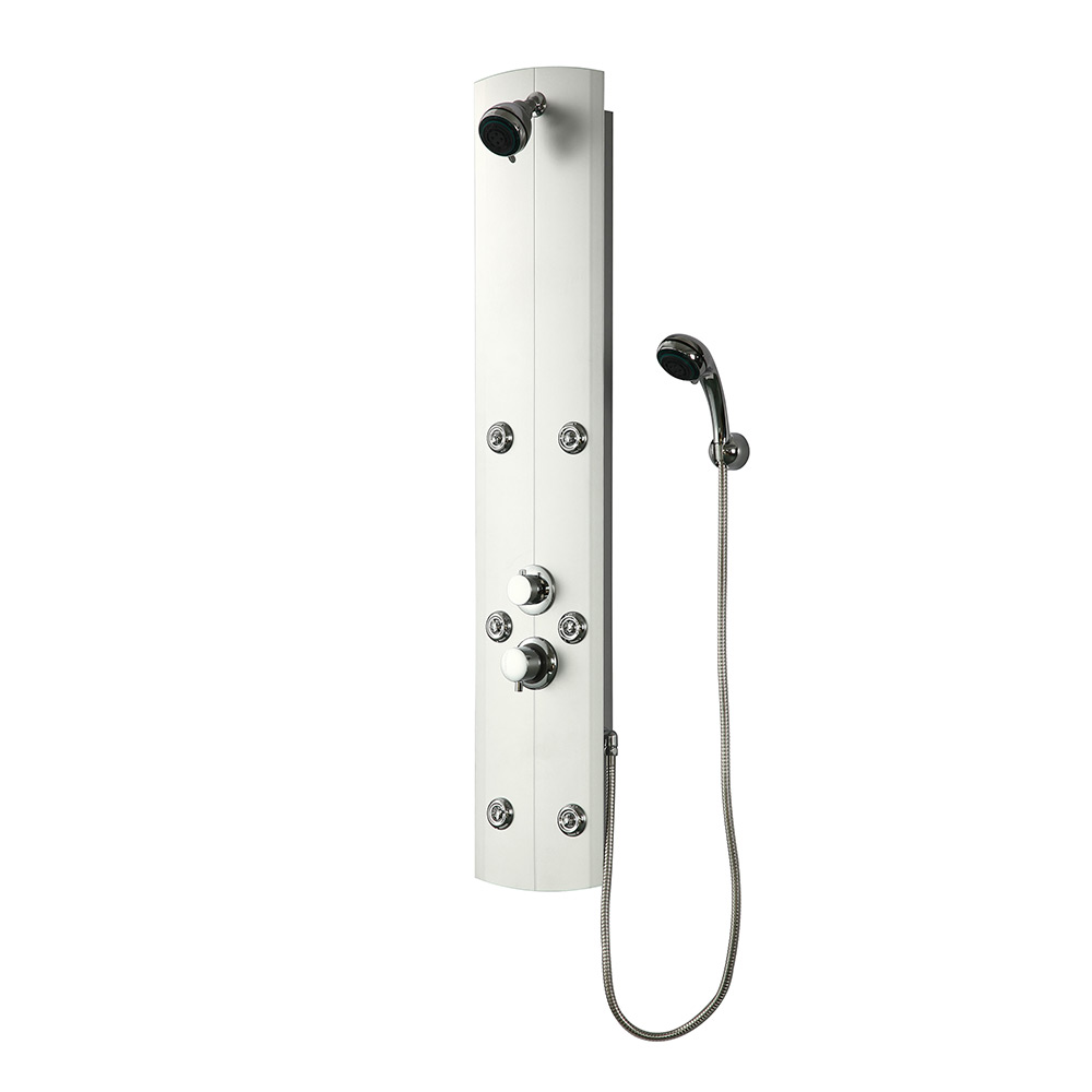 Coluna de hidromassagem prateada com acabamento em PVC de alavanca única. Tem 6 aspersores e aspersor superior em forma de oval.